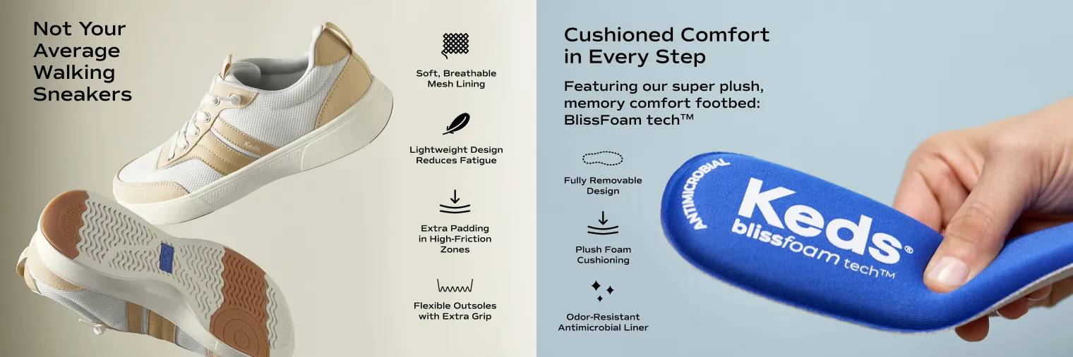 Featuring eye-catching metallic stripes and a retro-inspired design, the BlissWalk slip-on sneaker keeps casual looks right on trend. A heel pull tab and stretchy laces allow for an easy-on-easy-off design, while padding on the tongue and internal heel cushioning enhances wearability. The smooth leather upper, flexible rubber traction sole, and a Blissfoam Tech™ footbed to keep you comfortable and supported all day long.